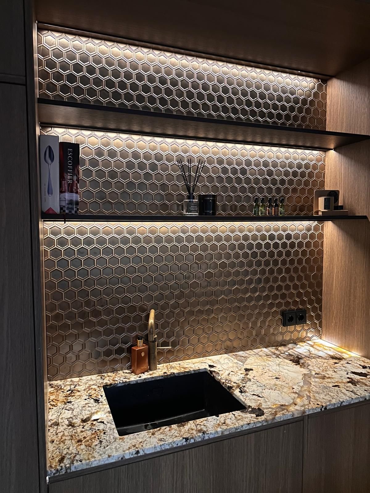 De opdrachtgevers gingen samen met de interieurarchitect naar DSE Natuursteen in Leerdam. “Wij werken regelmatig met DSE samen. De natuursteengroothandel heeft mooie exoten op voorraad, en is voor ons goed aan te rijden, ook voor klanten in de randstad.” De keuze viel op Patagonia, een kwartsiet uit Brazilië. “Deze natuursteen is zo ongeveer de hardst denkbare soort, een uitzonderlijke kwartsiet met veel karakter. Het gekristalliseerde gedeelte van deze natuursteen is lichtdoorlatend. Met licht achter de plaat wordt hierin de fijne kristallijne aard van het materiaal onthuld. Dit staat in sterk contrast met de niet-lichtdoorlatende delen waarin duidelijke vormen en kleuren zichtbaar zijn. De platen hebben een beige ondertoon met witte, zwarte en bruine kleurtonen. Wij hebben bij de stollenwand de steen in ‘open boek’ uitgevoerd. Normaal gesproken wordt een 20 mm dikke plaat gebruikt die aan de zijkanten wordt opgedikt. Wij hebben ervoor gekozen om de plaatdikte aan te houden. Vanwege het esthetische aspect – het ziet er rank uit – en omdat wij in de houten ladenrand van het kookeiland de ‘backlight’ ledverlichting wilden wegwerken. De uitdaging was dat de pixels van de ledverlichting niet te zien waren, met name in een zo dun mogelijke opbouw. Het effect is spectaculair. De kristallen kwartsdelen komen tot leven, je ziet de diepte. Uiteraard is de plaat daar bewust op geselecteerd en ingenest. De Patagonia is ook bij het werkblad voor de spoelbak toegepast. Op de achterwand is een hexagon mozaïek van The Mosaic Factory uit Nistelrode toegepast”, legt de commercieel directeur van FORS Tegelwijs uit.
