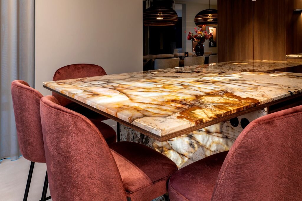 Blikvanger binnen de woonkeuken moest uiteraard het aanrechtblad van het kookeiland worden. “We hebben met FORS Tegelwijsheid regelmatig kookeilanden gemaakt waarbij de verlichting door de natuursteen heen te zien was. Dit wilden Sanne en ik ook”, vertelt Eddie. Marije vult aan: “De warme kleuren van de aders in de natuursteen zijn het uitgangspunt geweest voor de materiaal- en kleurkeuze van het interieur.”