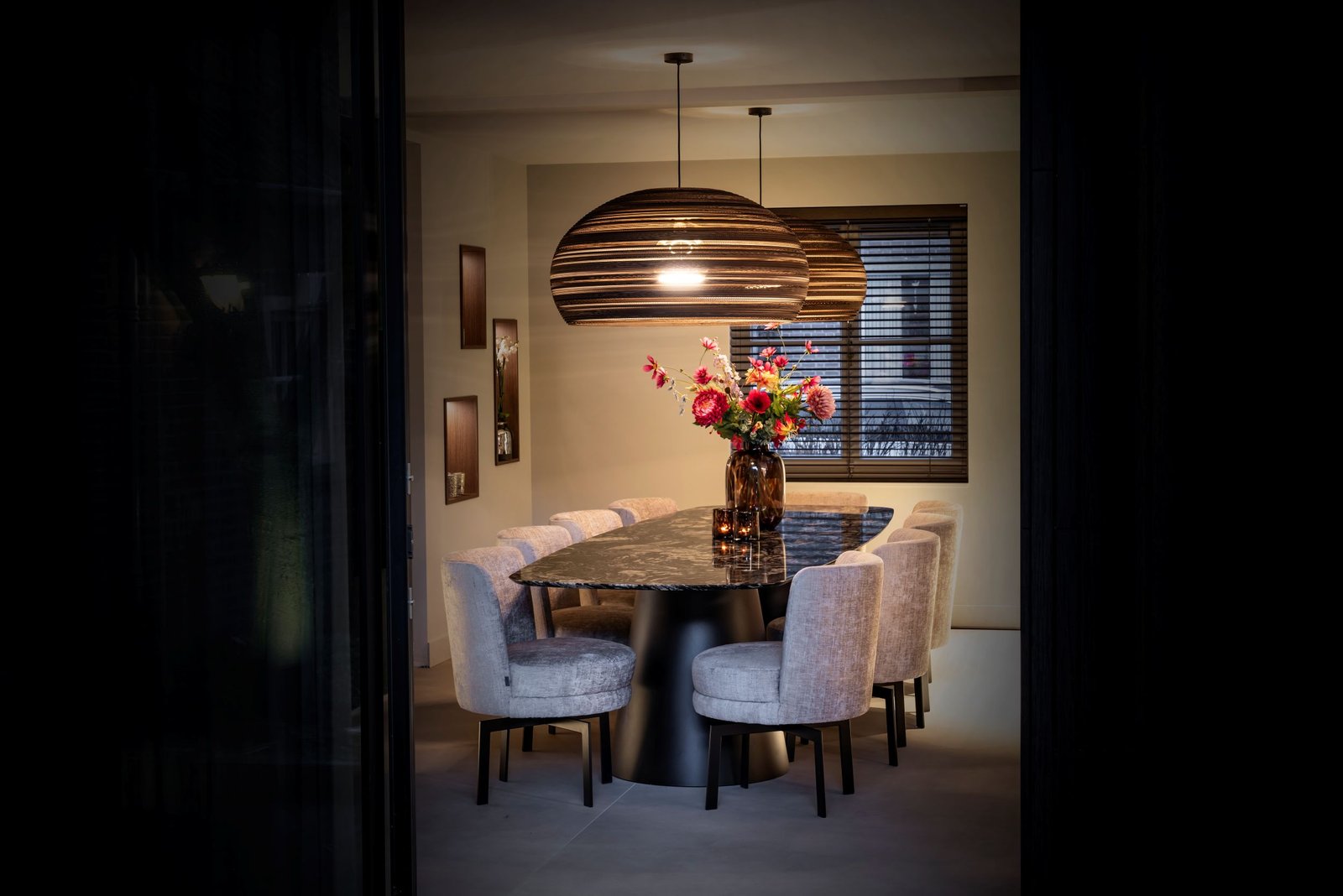 Nevi rent als een dolle door de woonkamer. Enthousiast kwispelend loopt de American Shepherd op de grote tafel af. “Dit is een van de pluspunten van ons nieuwe interieur en ook een van de wensen; een tafel waar we met het hele gezin aan kunnen zitten. En als je veel met natuursteen werkt, moet de tafel natuurlijk ook van natuursteen zijn. We hebben gekozen voor een tafel uit één stuk, van Sensa van Cosentino, een graniet in de kleur Indian Black. Die matchte qua kleur heel mooi met de Patagonia uit de keuken, en de tegel op de vloer. De afmeting is 340 cm, de vorm is Deens ovaal en de afwerking is door ons onder 55 graden negatief gejet.”