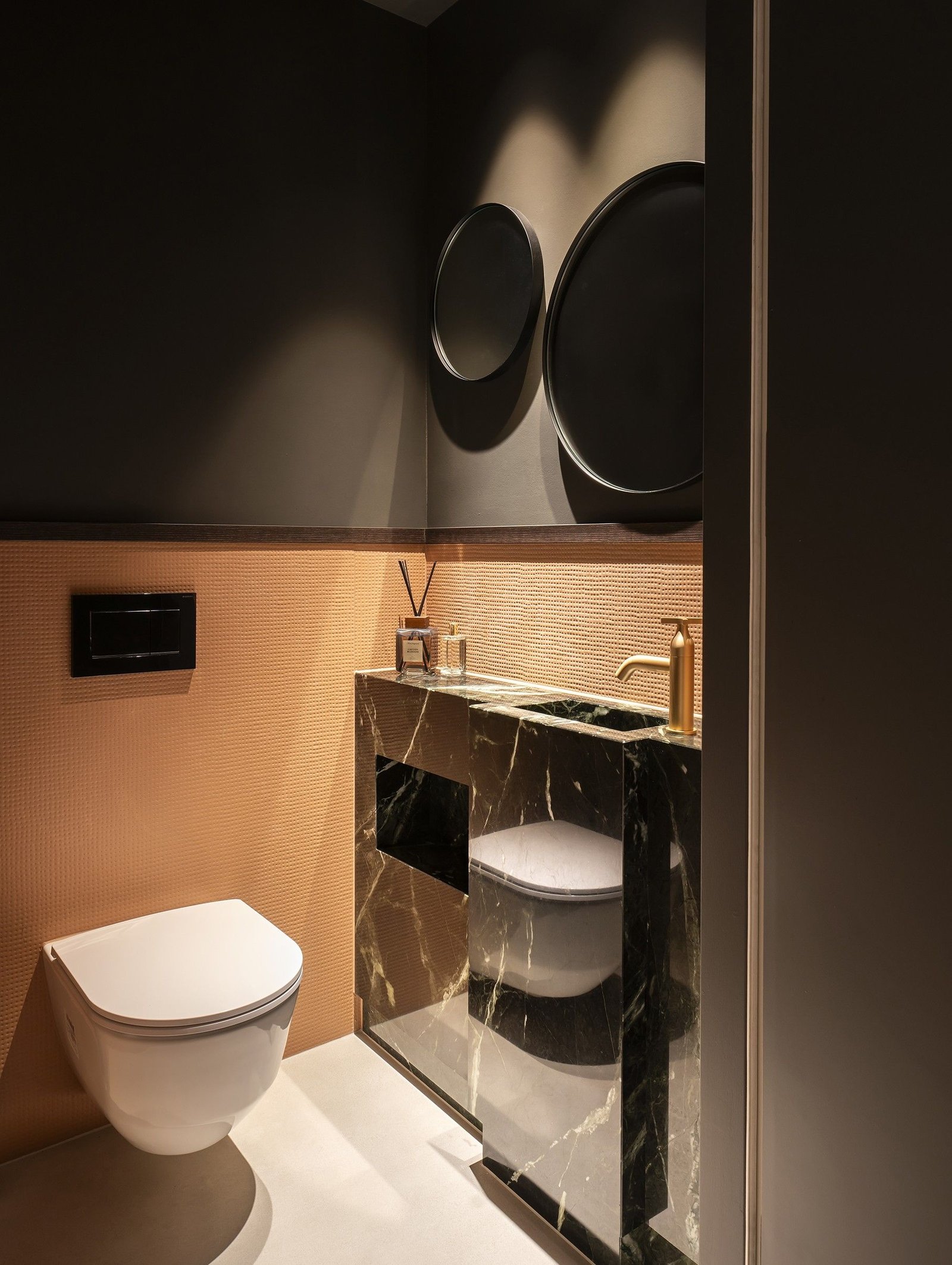 Ook op het toilet is natuursteen toegepast, vertelt Eddie. “Niet op de wand, want daar hebben we gekozen voor de Mutina Bas Reliëf, een handgemaakte tegel, model Pico in de verrassende kleur terra. Door het reliëf lijkt het bijna behang. Met strijklicht erop krijg je een prachtig, haast spannend effect. Dit is gecombineerd met een maatwerk wastafeltje van Veria Green, een Griekse marmersoort.”