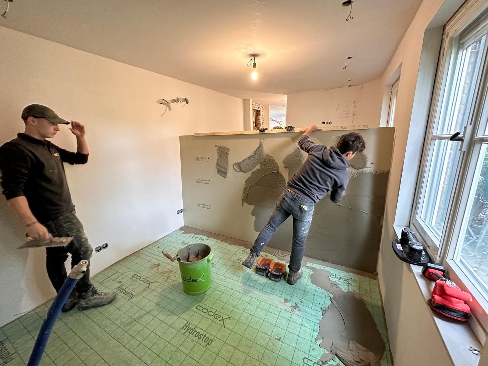 FORS Tegelwijs staat ook wel bekend vanwege de specialisatie als tegelzetter, de oorsprong van het bedrijf. Regelmatig werkt het bedrijf met groot formaattegels. Voor zijn eigen huis wilde Eddie deze ook op de vloer toepassen. “Vanwege onze ervaring met merken keramische tegels, wilde ik tegels van Laminam in de afmetingen 1620 x 3240 x 5, de maximale afmeting. En vrijwel naadloos gelegd, je moet er als het ware naar zoeken. Ik heb vrijwel alle steenmaterialen gekozen, Marije zocht vervolgens voor een kleur die in haar ontwerp paste. Voor de vloer koos zij voor Calce Grigio. Het was trouwens nog een dingetje om die enorme tegels tussen de twee muren geplaatst te krijgen”, lacht Eddie.