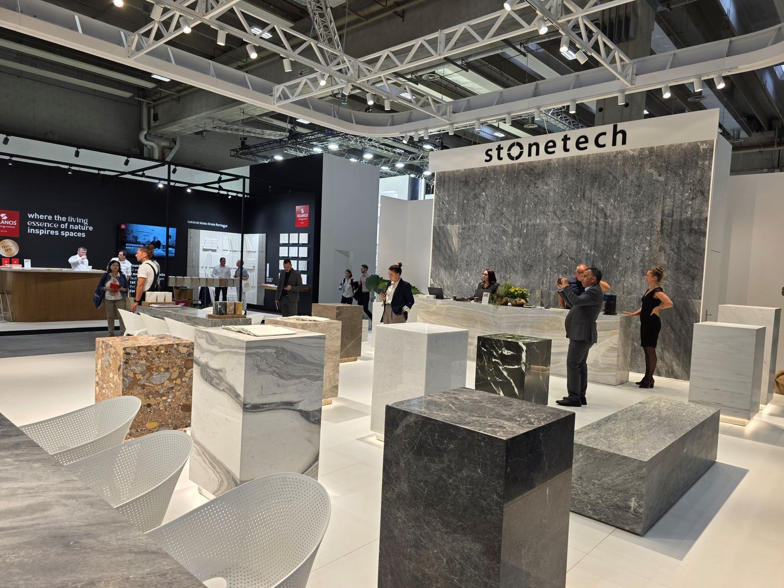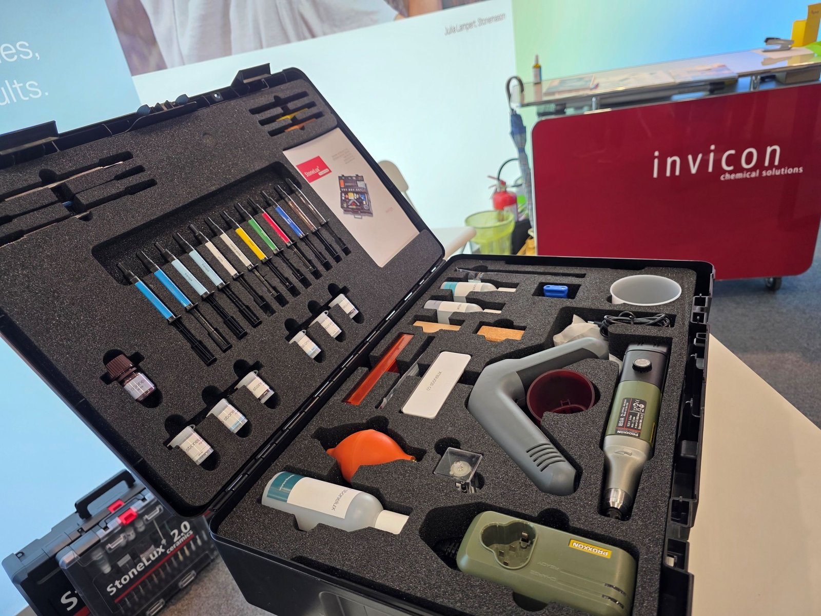 Het Oostenrijkse Invicon demonstreerde op de stand hoe beschadigingen aan natuursteen en keramische producten kunnen worden hersteld met behulp van Stonelux. In hal 7 werd de nieuwste generatie van het reparatiekoffer gepresenteerd.