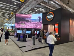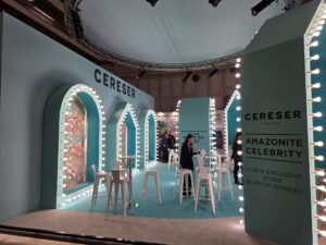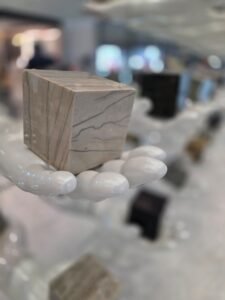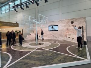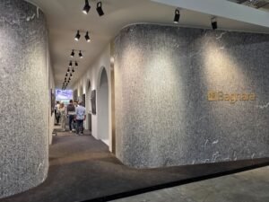 De Braziliaanse natuursteensector presenteerde zich gezamenlijk in hal 1. En als je Brazilië zegt, dan zeg je kwartsiet. Hier waren een paar echte ‘beauties’ van te zien, maar twee presentaties vielen extra op. Achterin de hal was een heus basketbalveld van kwartsiet opgebouwd, inclusief een tribune. En direct bij de ingang van het paviljoen presenteerde het Braziliaanse bedrijf Verzu kleine blokken natuursteen op handen van marmer. Een kunstige vondst en uitvoering, die door de organisatie werd beloond met de Best Communicator Award in de Visions Category.
