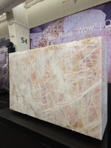 Maar er was op natuursteengebied zeker veel meer moois te bewonderen in Verona. In hal 6 presenteerde de Italiaanse natuursteengroothandel Nikolaus Bagnara op haar stand met als thema ‘Xperience endless beauty’ drie nieuwe steensoorten: Green Galaxy, een Braziliaanse kwartsiet met een diepgroene kleur en levendige adering; Dreamtime, een Australische marmer met een drukke, bijna theatrale tekening en Stella Alpina, een 100 procent kwarts kristal die in het gebied tussen de Alpen en het Noord-Italiaanse Valtellina wordt gewonnen. Van deze steen heeft Nikolaus Bagnara het exclusieve distributierecht.