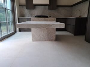 De investering in de machine past ook bij het verleggen van de activiteiten van Natuursteen Ingels. “Daar waar wij vooral in grafmonumenten gespecialiseerd waren, heeft de maatschappelijke trend van begraven naar cremeren – in onze regio kiest zo’n 75 procent voor een crematie – vrijwel automatisch ertoe geleid dat ik meer bouwwerk ben gaan produceren. Daar waar het grafmonumenten betreft, lever ik geen kant-en-klaar grafwerk meer, maar doe ik de productie zelf. En ik maak dorpels van Belgische blauwe hardsteen en bijvoorbeeld keukenbladen van de meest mooie natuursteensoorten”, vertelt Patrick, terwijl hij een foto laat zien van een prachtig massief keukenblad van Taj Mahal.