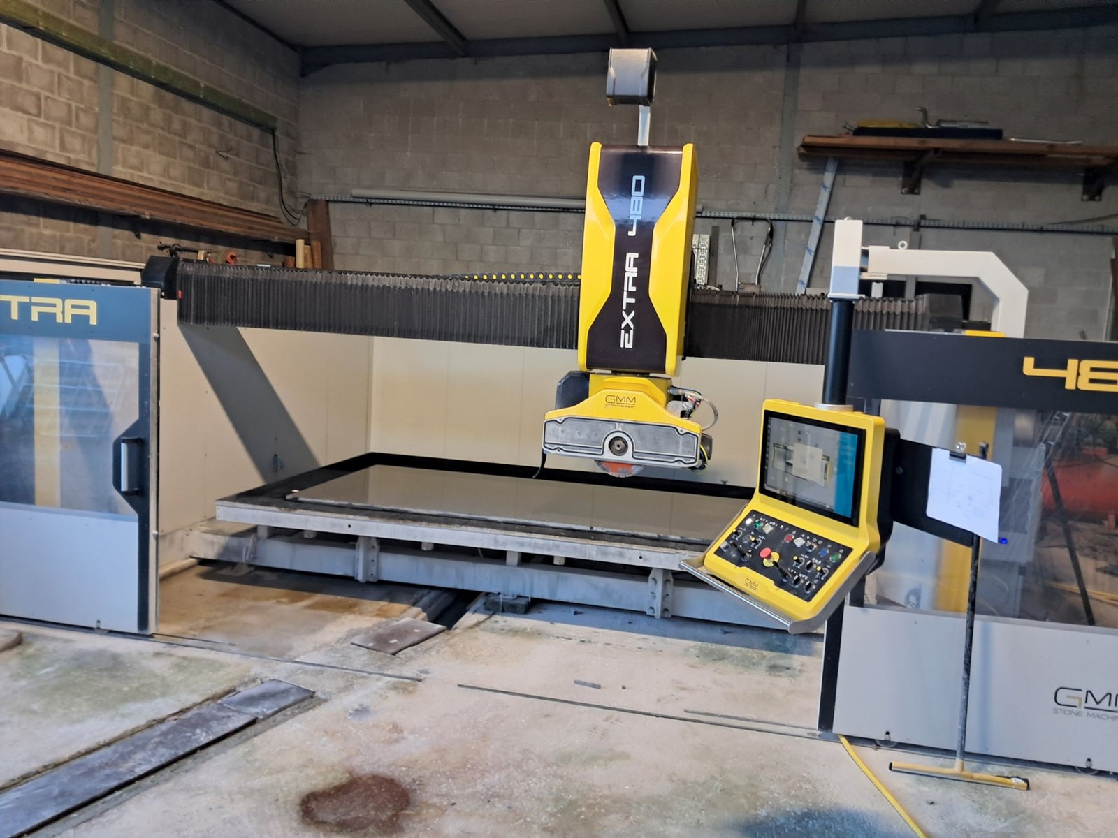 De keuze viel op de GMM Extra 480. “Dit is een 5-assige cnc-gestuurde brugzaag”, begint Joeri zijn uitleg over de machine. “De kop heeft een rotatie van 370° die 90° kan worden gekanteld, is uitgerust met camera en vacümmanipulatie en alle opties nodig om automatisch te werken. Ze kan zagen en frezen, het is een echte alleskunner net zoals Patrick. Patrickkocht samen met de machine ook Easystone aan, een CAD-CAM software waar hij ook massieve projecten wou gaan frezen. Die opleidingen hebben we in overleg met Patrick in verschillende stappen gedaan, zodat hij alle kennis die wij in eigen huis hebben, goed in de vingers had voor we een stap hoger gingen. Hij is met brio geslaagd. Het is een van de laatste machines die ik in de typerende gele kleur van GMM heb geleverd. Na de overname van GMM door Biesse Stone worden de machines in de nieuwe kleur Wonder geleverd.”