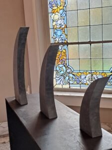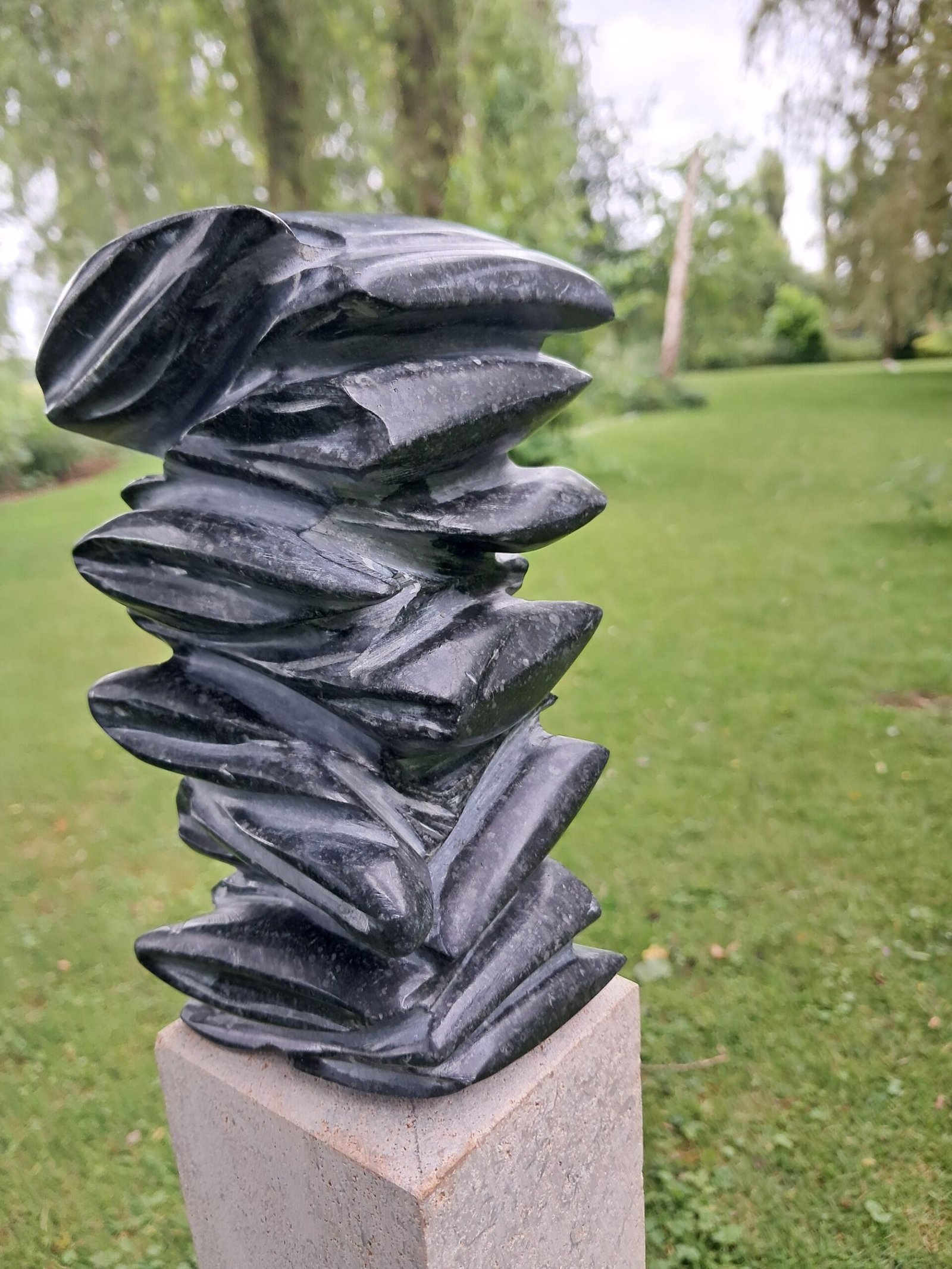 In de krappe kantoorruimte staan naast de ingang een aantal kunstwerken. “Dat is een hobby van mij”, luidt de verklaring van Patrick. “Ik vind natuursteen een fantastisch materiaal om mee te werken. Ik wil mooie dingen maken en dat kan zeker met Belgische blauwe hardsteen, marmer en graniet. Heel toevallig kwam ik erachter hoe fijn het werken met Jasberg graniet is. Een klant had een kant-en-klaar grafmonument besteld. Volgens zijn instructies had ik het monument besteld, maar bij levering bleek het niet goed te zijn. De fout lag bij de klant, hij wilde een nieuw monument. Ik nam mijn verlies, zegde de klant af en begon een beetje uit te proberen met de Jasberg. Daar kon ik geweldig mooi mee hakken. Dat is het mooie, als de steen doet wat jij in gedachten hebt. En zo heb ik het het liefst, als ik het op mijn eigen manier kan doen. Zelf mijn tijd indelen qua werk, zelf mijn klanten kiezen en qua producten een combinatie van graf-, bouw- en interieurwerk maken. En op de vrije zaterdagnamiddag mooie kunstwerken maken.”