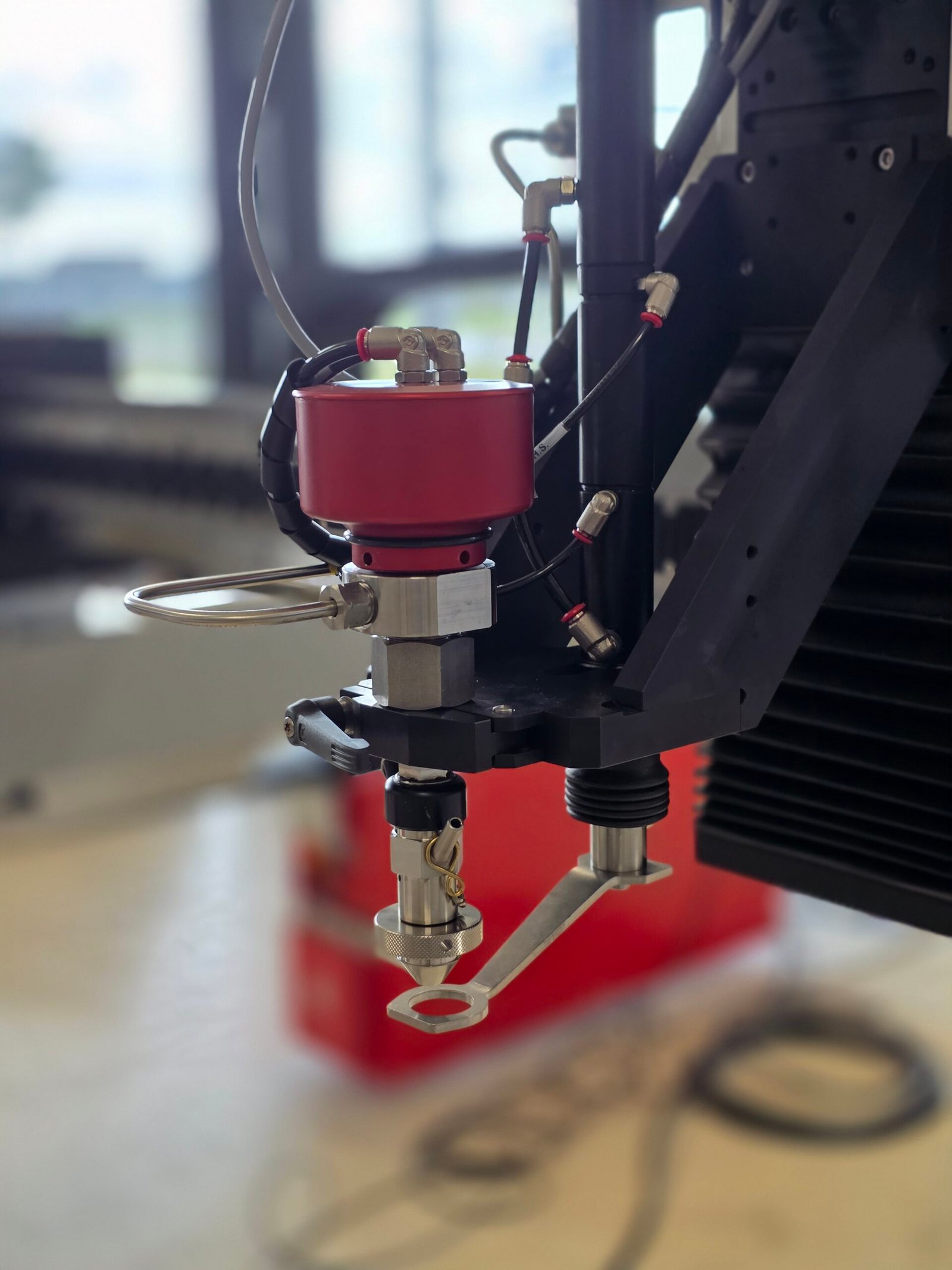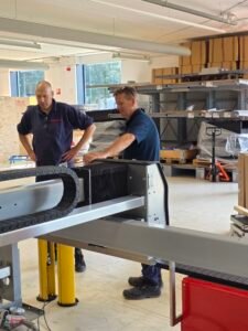 In de werkplaats zijn een aantal monteurs een machine aan het opbouwen. “Voordat een machine naar de klant gaat, wordt die hier eerst helemaal opgebouwd en getest, dat is standaardprocedure. De pompen worden in een aparte testruimte 24 uur getest voordat ze naar de klant gaan”, vertelt Jan Henk. “De machine die hier wordt opgebouwd is de ACM2040-1 met een 2,5D snijkop. Deze uitvoering met een 2,5D kop is de meest verkochte machine in de steenindustrie. De snijtafel bestaat uit een stalen constructie en lineaire motoren met directe aandrijving op elk van de twee hoofdassen. Om de vereiste precisie te bereiken, worden de brug en de zelfrijdende sledeplaat aan beide zijden door twee direct lineaire motoren aangedreven. Dit resulteert er bij deze tafel in dat er een snijbereik van 2020 x 4020 mm ontstaat. Ook is er gedacht aan de onderhoudsvriendelijkheid. De magnetische aandrijving resulteert in beter snijgedrag en een absolute herhalingsnauwkeurigheid van de snijkoppositie in vergelijking met de traditionele mechanische overbrenging zoals spindels, tandheugels en tandwielen. Hierdoor is de machine onderhoudsarm en heeft hij een snelheidsbereik van 1 tot 30.000 mm/min.