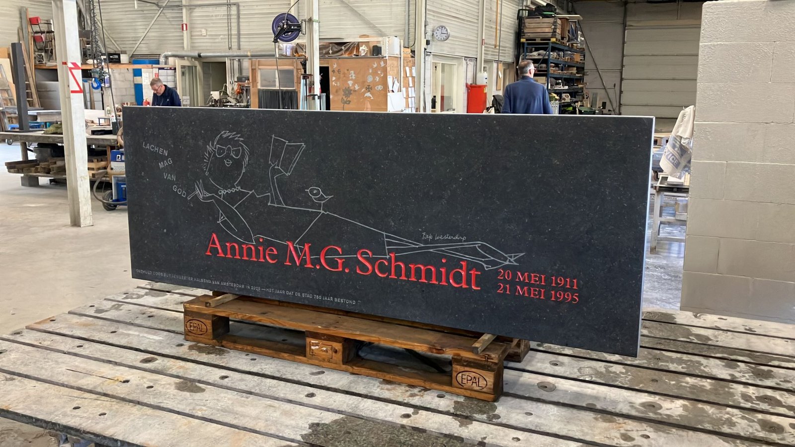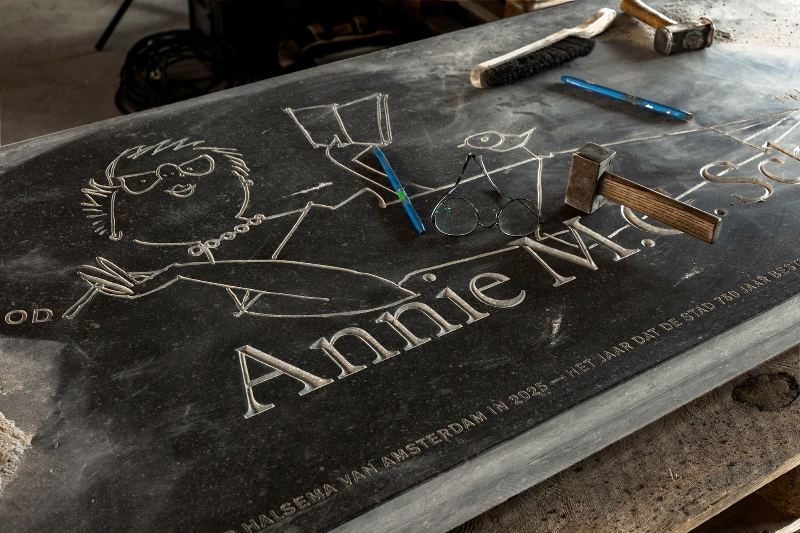 Foto’s in WhatsApp eind september wekten de nieuwsgierigheid. Het betroffen foto’s van ‘the making of’ van een gedenksteen voor Annie M.G. Schmidt. Een zwierige tekening met uitgehakte letters, rood geverfd op een Belgische blauwe hardsteen. De zoektocht naar de herkomst van deze steen leidde naar De Nieuwe Kerk in Amsterdam, waar de ‘schrijverssteen’ is geplaatst, de ontwerper Berry Slok, het natuursteenbedrijf Van Luijn Natuursteen, de plaatser SvR Restauratie en naar Henk Welling, uitvoerder van diverse schrijversstenen en ontwerper van één.