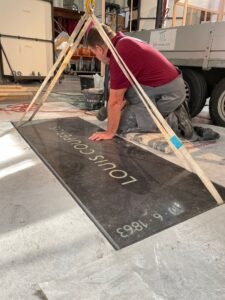 Voor het terugplaatsen van de stenen moet Sander aanpassingen aan de steen aanbrengen, vertelt hij. “De eis voor de vloer in De Nieuwe Kerk is dat er zelfs een heftruck over de stenen kan rijden. Dit in verband met het opbouwen en afbreken van exposities. Hiervoor moet een steen volzat in de mortel worden geplaatst. Om dit te kunnen doen, moeten we de steen dunner maken; 10 cm dik eruit en 8 cm dik erin. We hebben dit ook met de oude gedenksteen van Van den Vondel moeten doen, een steen met een behoorlijke historische waarde. Die zerk had een dikte van 20 cm, moest dus een heel stuk af. Best spannend, kan ik je zeggen. Maar het is goed gegaan.”