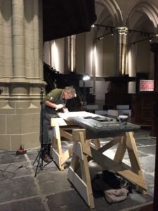 Voor de selectie van de steen ging Michiel naar Carrières du Hainaut in Soignies. “We hebben daar een aantal platen Belgische blauwe hardsteen bekeken. We wilden binnen de plaat zelf een stuk kiezen waar we de tekening en de letters op aan gingen brengen. De plaat had de vereiste dikte van 8 cm. We hebben de maat erin afgetekend. De plaat is eerst gezoet, daardoor kun je mooier het sjabloon van de handletter op de steen zetten. Bovendien had De Nieuwe Kerk als eis dat de steen donker gezoet moet zijn. Het geeft een mooi contrast met de gezandstraalde tekening. Hierover hebben we veel overleg met Berry en Sander gehad. De uitvoering was namelijk millimeterwerk, de letter moest als het ware over de tekening heen vallen.”