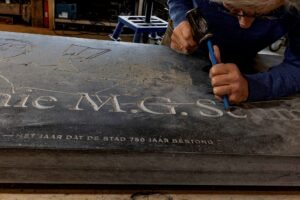 De allereerste steen die Henk heeft gehakt, was voor hem heel bijzonder. “Ik heb die op locatie, dus in de Nieuwe Kerk zelf gemaakt. Een extra bijzondere ervaring omdat er natuurlijk niets mooiers is dan dit te doen op zo’n plek én in een steen die uit de vloer was gehaald. Het was als het ware terug in de tijd met alle aandacht voor het ambacht. Ook was het apart dat bezoekers mij aan het werk konden zien. Het gegeven mee te kunnen werken aan schrijversstenen die, naar ik hoop, voor de eeuwigheid in de Nieuwe Kerk te Amsterdam blijven liggen, ervaar ik als heel bijzonder en vind ik een grote eer.”