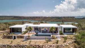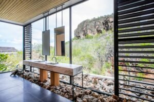Bruce verontschuldigt mede-eigenaar en architect Geert Verschuren. “Hij is momenteel in onze tweede vestiging in Willemstad op Curaçao. Daar is onlangs een villa opgeleverd naar een ontwerp van ons, geen prefab bouw, maar traditionele bouw. De villa ligt strak tegen de Tafelberg aan, een afgeplatte heuvel bij het Santa Barbarastrand. De breuksteen die bij de villa is toegepast, is uit de Tafelberg afkomstig. De Mijnmaatschappij Curaçao ontgint daar de kalksteen uit de berg. We hebben de rotsen van de berg als het ware naar binnen gehaald, want de steen ligt voor en achter de glazen gevel in bakken.”