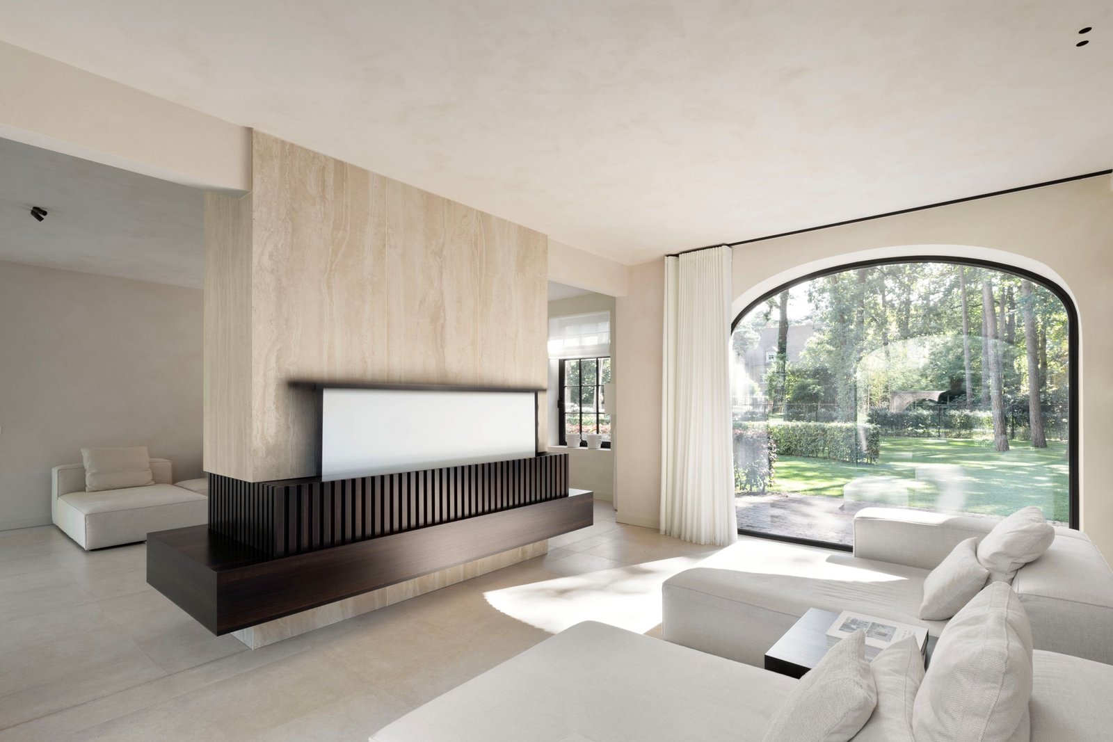 Over de keuze tussen natuursteen en keramische materialen is Bruce helder. “Natuursteen binnen, keramische materialen buiten. Dat is grofweg onze stelregel. Maar die gaat natuurlijk niet altijd op. De keuze wordt vaak ook bepaald door het budget. Als we veel vierkante meters moeten bedekken, kiezen wij veelal voor keramische materialen. Dat is in de regel goedkoper, vooral omdat natuursteen voor buitentoepassingen vaak extra afwerkingen behoeft, wat het in totaal duurder maakt. Wij willen graag een groot gebaar maken. Daarom passen we maximaal drie verschillende materialen toe, waarvan één de show moet stelen. Dat is de absolute eyecatcher. Zoals de travertinlook keramiek bij de villa in Vught. En eenmaal dat materiaal gekozen, dan wordt het ook binnen toegepast.”
