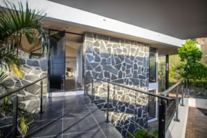 Op de foto’s van de imposante villa is een vloer in groot formaat tegels te zien. “Het heeft onze voorkeur om smeervloeren toe te passen. De omstandigheden ter plaatse – dicht aan de zee – zijn te zout voor dergelijke vloeren. Daarom hebben we gekozen voor een keramische vloer. In combinatie dus met de natuursteen uit de Tafelberg. Wij zoeken vaak de warmte in een ontwerp in de combinatie van materialen, hout en natuursteen. Zeker op Curaçao, waar de nadruk meer op natuurlijke materialen ligt. Dit in tegenstelling tot Nederland. Hier is de trend wat strakker.” Als voorbeeld laat Bruce een project in Vught zien. Bij de villa is een kolom die over drie verdiepingen doorloopt de absolute eyecatcher. “Dit is keramisch materiaal van de Meissen Keramik uit het Duitse Oberhausen in een travertinlook. De steen komt ook in het interieur terug als verbinding tussen buiten en binnen. Vaak maken we in onze ontwerpen gebruik van patio’s om die verbinding te accentueren.”
